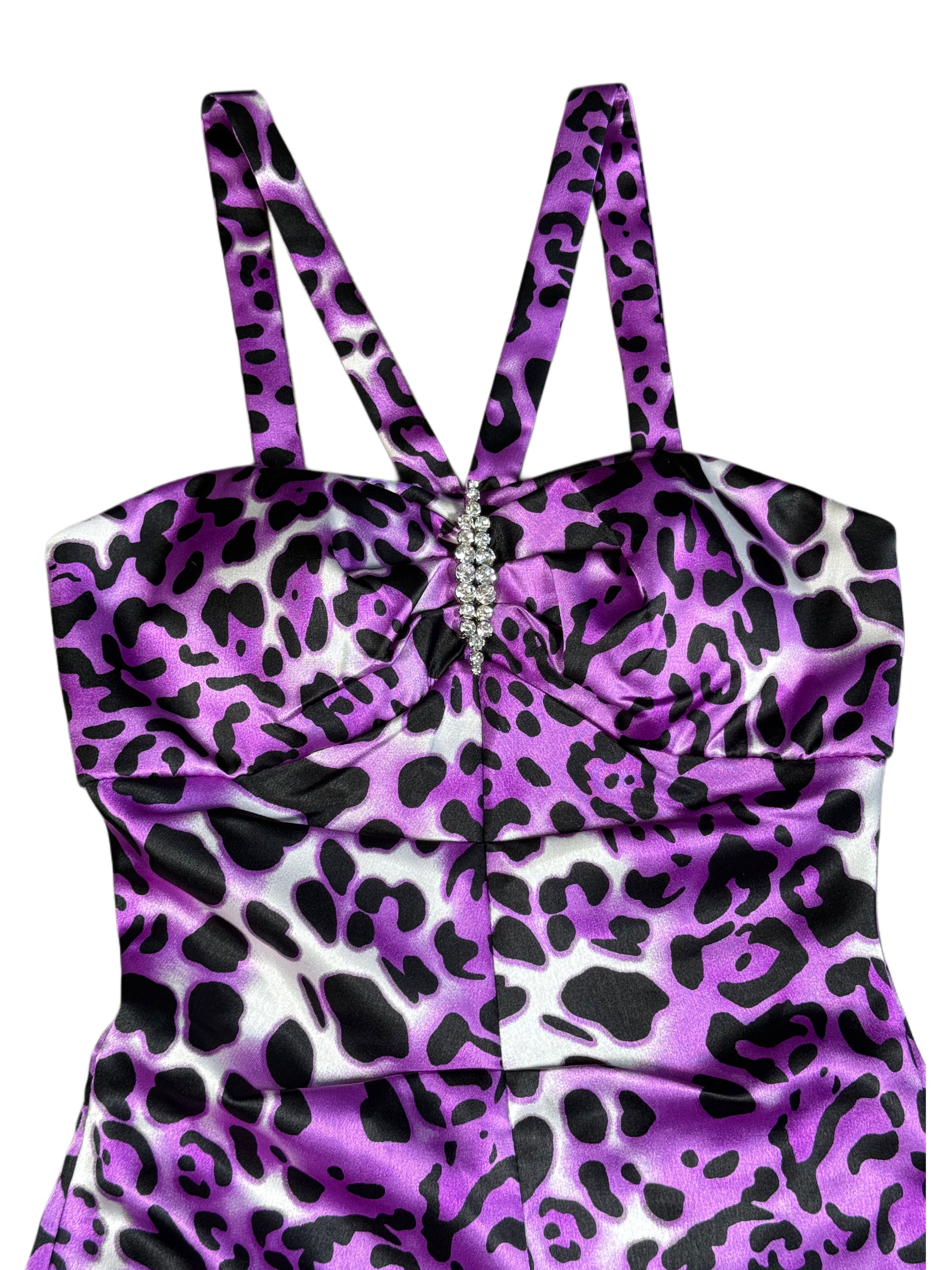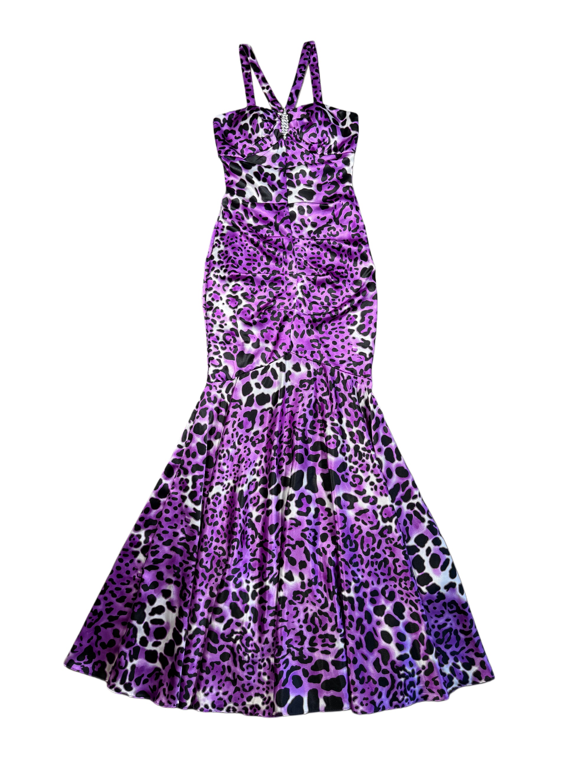 You finally found your perfect prom dress, babe! Beautiful purple, black and white cheetah print mermaid dress with built in padded bra and ruching. Oh so flattering and one of a kind.
