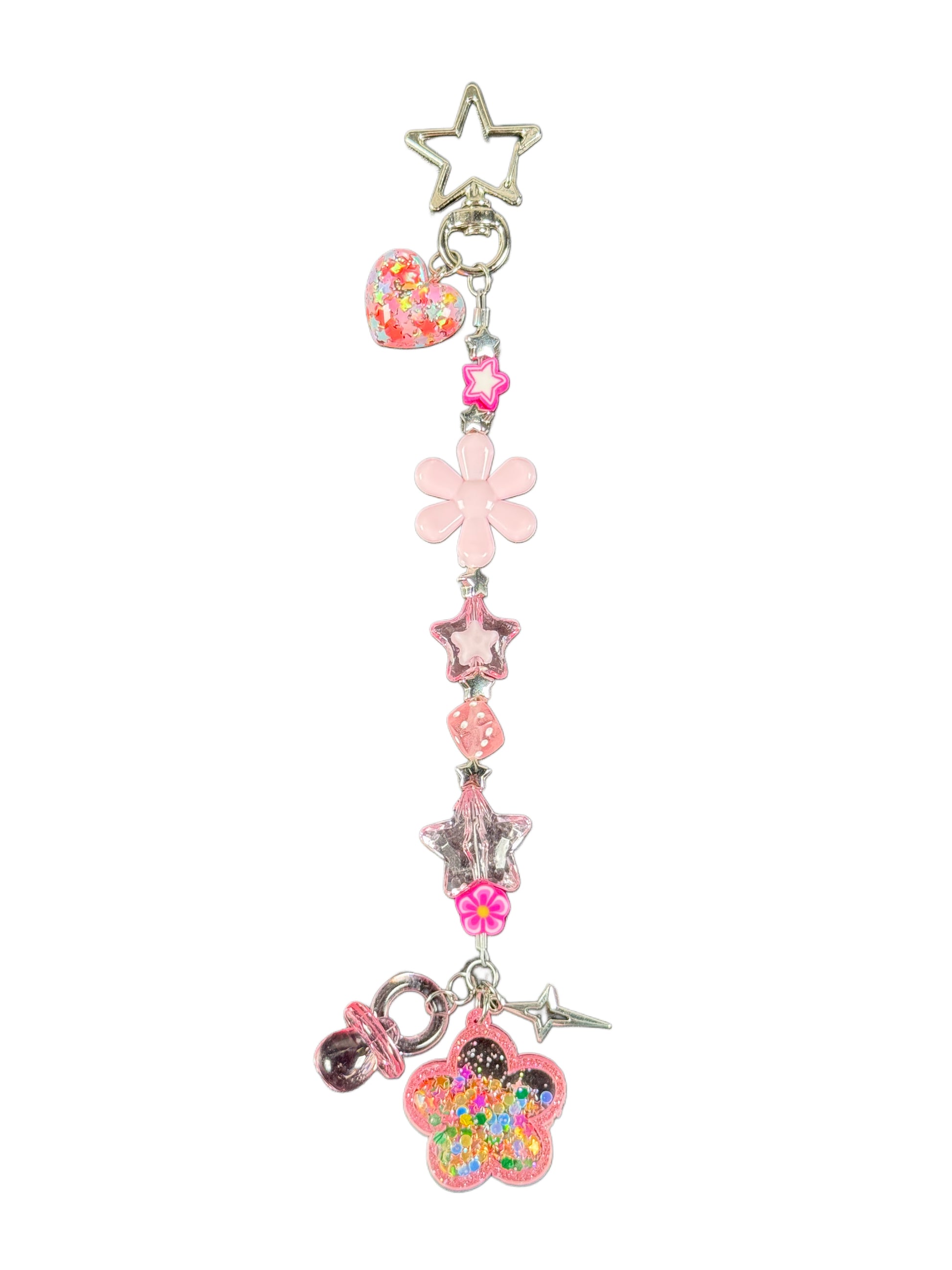 Pink, pink, and pink Y2K inspired beads with silver stars and pacifier pendant. Star lobster clasp measures 1 inch wide and clasp opening is 1/2 inch. 7 inches long.