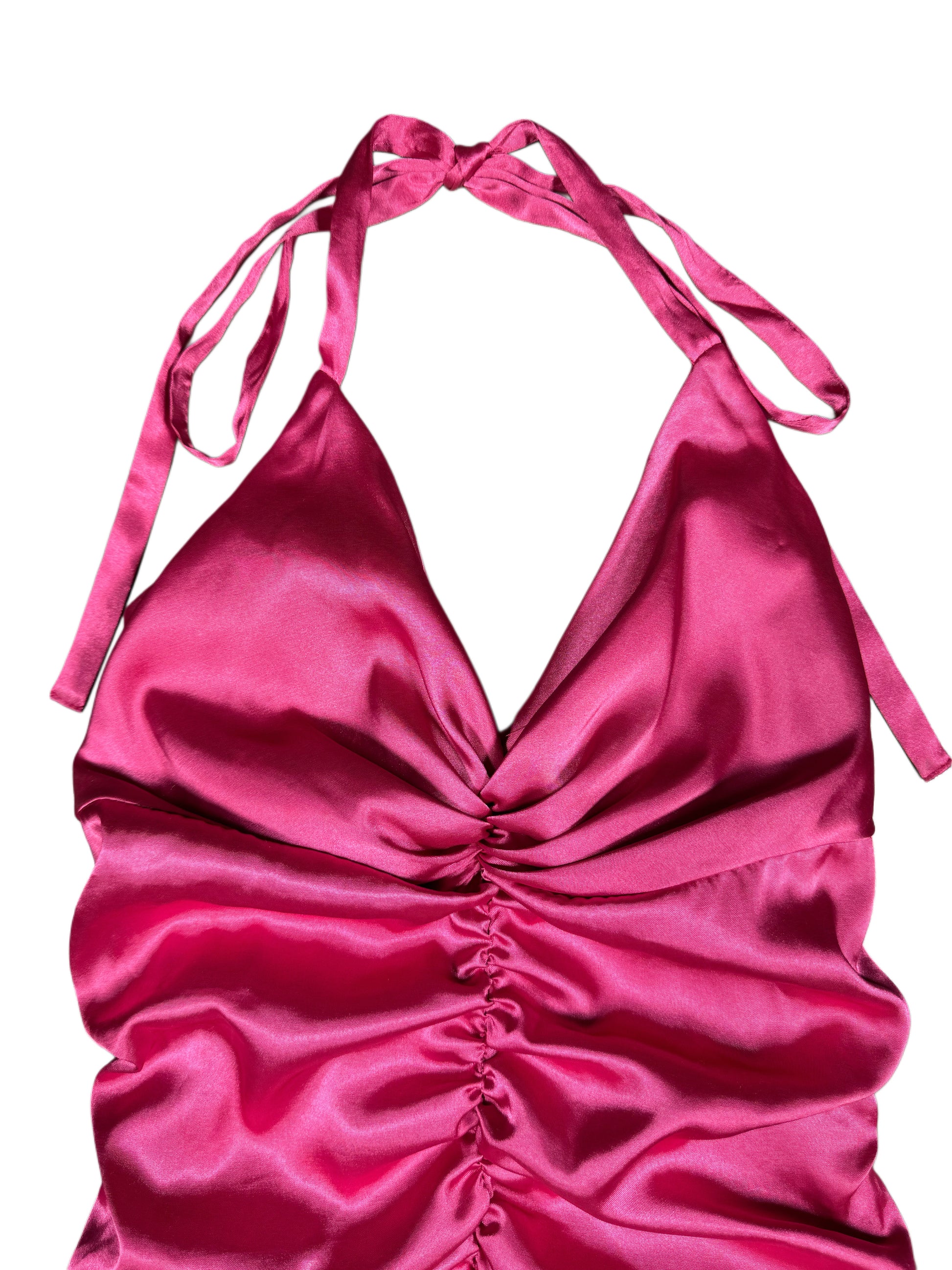 One of one 2000s vintage Jessica McClintock hot pink midi mermaid dress with ruching throughout. Tie halter and side zip.